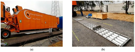 As shown in Figure 5, MLS66, the 4th generation linear full-size pavement acceleration loading device with the advantages of self-movement, high-loading frequency, compact structure, and high degree of automation was used for the pavement loading test. The loading parameters of MLS66 were referenced in previous studies [2]: the effective loading length is up to 6 m, the two-wheel axle load is 100 kN, the ground pressure is 0.7 MPa, and the loading speeds are 10 km/h, 15 km/h, and 22 km/h, respectively,