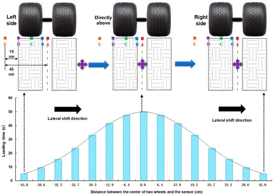In addition, the lateral movement system equipped with MLS66 can also be used to simulate the wheel track distribution over the road surface cross-section effectively and to investigate the dynamic response of the road surface in time and space. The lateral moving loading scheme is shown in Figure 6. When this system is turned off, the center of the loading twin wheels on one side is directly above the sensor. After the lateral movement system is turned on, the loading wheel moves right and left above the sensor, and the distance is negative when the center of the two wheels is located on the left side of the sensor. The distance is positive when the center of the two wheels is located to the right of the sensor. In vertical cyclic loading, the lateral moving distance of the loading wheel and the loading time is usually distributed, with loading times for loading wheels located above and near the sensor being much longer than loading times for loading wheels located away from the sensor. The output signals of transverse, longitudinal, and vertical strain sensors are collected, and the strain time history curves are drawn during a complete lateral movement period. Five measuring points on the double wheel’s bottom surface were defined to better analyze of the effect of the loading wheel’s position on the strain time curves. The loaded wheel moved laterally and worked in five positions [44].