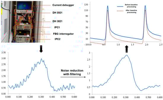 DH-5921 and DH-3821 devices are used for sensor data processing, and this meets the requirements of high-frequency acquisition of stress and strain at 200 Hz and low-frequency acquisition of temperature and humidity at 2 Hz, respectively. As shown in Figure 8, the sensor readings are interpreted by the system analysis software DHDAS version 2.3 and exported to an EXCEL 2021 (Microsoft) file for subsequent analysis. Because some of the collected data have noise problems, the sensor signal needs to be further filtered and denoised, and the reasonable step value is selected by the moving average method to ensure the authenticity of the data to the greatest extent. It should be noted that for strain sensors, there will be strain accumulation at the initial loading stage, forming a peak phase difference in response. Therefore, it is necessary to subtract the data near the baseline (time t = 0) from this type of sensor’s output signal time history curve to take the data of the modified signal response curve.