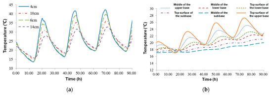 Figure 9b describes the change curve of the temperature field of the base and subbase layers with the depth and time of the road surface. The temperature of the base and subbase layers also showed an overall rising trend. The highest temperature also appeared in the top layer, and that of the base layer was 27.3 °C. During the three-day test period, the temperature of the top layer increased by about 5 °C as a whole. With the increase in the structure layer’s depth, the variation range of the temperature in a day gradually decreased. Lower layers of the pavement structure had stable temperatures.