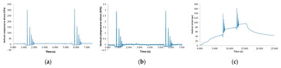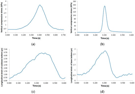 Figure 17b presents the response data of the pressure gauge at the subgrade’s top surface. Compressive stress sensors at the top surface of the subgrade and compressive strain sensors at the top surface of the base were located in the same vertical position and synchronized with each other. The sensor pulse waveform was consistent with that of the compressive stress on the base’s top surface, but the stress response amplitude was small, and the maximum peak stress was only 0.29 kPa, which was smaller than the peak compressive stress under vehicle load. After unloading, the stress of the sensor recovered quickly and no obvious residual stress was generated.