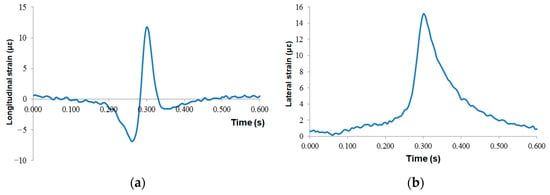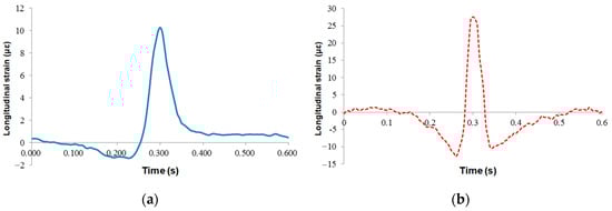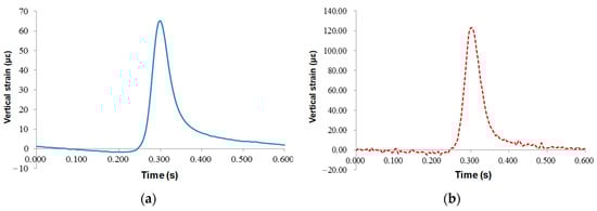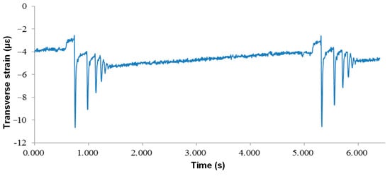 In the above sensor responses, the FWD load plate is always located on the top surface. Figure 18 shows the lateral strain sensor’s time history curve when the load plate is 50 cm away from the sensor. The overall performance of the lateral sensor was the compressive strain, and the peak value of compressive strain decreased rapidly under two impact loads. The peak strain of the two loads was 1 to 2 με, and the strain decreased by 2.83 με and 2.66 με, respectively.
