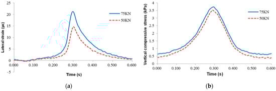 Figure 10a,b present the time-history curves of pressure gauges of the subgrade layer. It can be seen that the top surfaces of the base and subgrade layers were under pressure. The response time on the top of the base was short, the peak value changed obviously, and the maximum peak stress was 159 kPa. The maximum compressive stress of the subgrade was 3.55 kPa. Due to the stress diffusion effect, the response time of the subgrade was significantly greater than that of the base—about four times that of the base.
