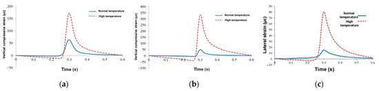Figure 15c presents the middle asphalt layer’s lateral strain under different temperatures. At normal temperature, the middle asphalt layer of the wheel track edge was under pressure under the vehicle load, and the maximum compressive strain was 15.5 με. The strain response curve of the sensor was similar to the vertical strain response of the middle and lower asphalt layers. Before the vehicle load arrived, the middle asphalt layer was subjected to a certain tensile stress. When the load arrived, it was in a state of compression.