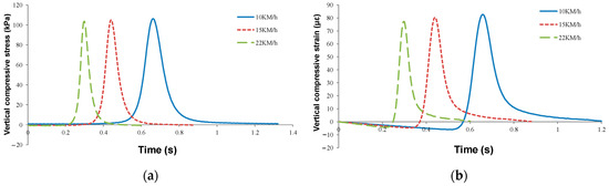 The dynamic response of vehicle load at different driving speeds was simulated. As shown in Figure 16a, the interval time between two adjacent wheels was different at different loading speeds: the interval times between adjacent wheels at 22 km/h, 15 km/h, and 10 km/h were 0.6 s, 0.88 s, and 1.3 s, respectively. Therefore, the action time of vehicle load at any point in the pavement structure increased continuously with decreasing loading speed. However, the vertical compressive stress on the base’s top surface remained unchanged and did not increase with the decrease in loading speed.