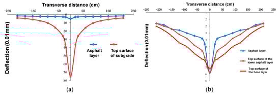 Comparison of deflection basin: (a) asphalt layer and subgrade, and (b) asphalt layer and base layer.
