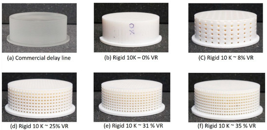 Commercial delay line (Ultran, Inc., State College, PA, USA) and 3D-printed metamaterial delay lines with different void ratios: (a) commercial delay line with a uniform acoustic impedance; (b–f) fabricated metamaterial delay lines with a measured void ratio between 0% and about 35%.