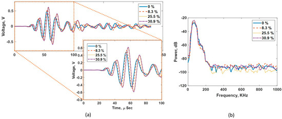 (a)Acquired time-domain signal showing the time delay as the VR increases. (b) Frequency power spectrum showing a consistent energy distribution for the samples with different VRs.