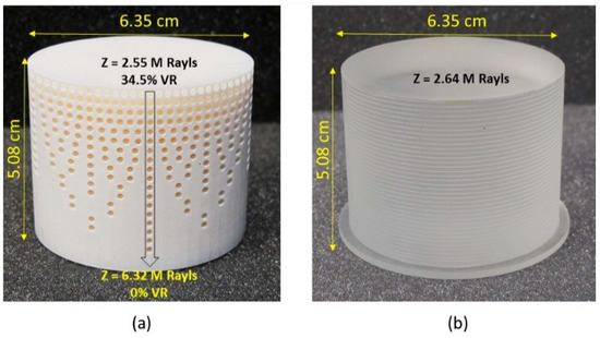 In order to obtain the best coupling between the sensor and the target medium, a delay line with a continuously varying impedance from 2.55 MRayls to 6.32 MRayls was designed, as shown in Figure 7a. Due to the graded impedance, the overall velocity of the longitudinal wave in the metamaterial DL was higher than that in the DL with a uniform impedance of 2.64 MRayls. The metamaterial DL had a cylindrical design with a diameter of 6.35 cm and a height of 5.08 cm. The void density was gradually reduced from 34.5% to 0 (column vice, with two rows having the same void density), as shown in the Figure 7a. Voids were equally distributed across the cross-section such that the propagating wave did not feel any local material change due to voids. It is important to note that the cylindrical void design, void diameter, and distribution were purely controlled and chosen to facilitate a simple additive manufacturing process. The appearance of the fabricated metamaterial DL was compared to that of the commercial DL, as shown in Figure 7b. The commercial DL had the same dimensions but a uniform acoustic impedance of 2.64 MRayls.