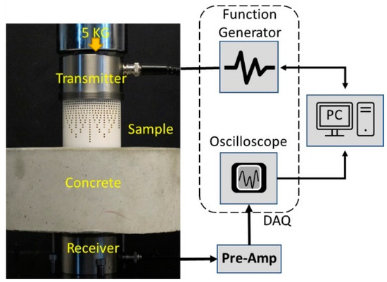Figure 8 and Figure 9 show the experimental setup for through-transmission (TT) and pulse–echo (PE) concrete testing, respectively. The sensors and DAQ system used in this setup were the same as those in the experimental setup discussed in Section 3.1. In the TT setup, a pre-amplifier from Olympus, Tokyo, Japan (Model no: 5660B, with a custom frequency ranging from 20 KHz to 2 MHz), at a 40 db gain was used with the receiver to amplify the acquired signal. The concrete sample used for testing was cylindrical with a diameter of 21.6 cm and a height of 8.2 cm. The concrete sample had a density of 2242.5 kg/m3, longitudinal wave velocity of 3250 m/s, and an impedance of 7.3 MRayls. In the TT measurement, the transmitter generated an ultrasonic Gaussian pulse with a center frequency of 100 KHz with 0.5 bandwidth (fractional bandwidth in the frequency domain of the pulse). The generated stress waves passed through the delay line and the concrete sample before being acquired by the receiver (refer to Figure 8). A thin sheet of soft silicone (Ecoflex™ 00-10) was used as the couplant between the receiver and the concrete to increase the contact area. Glycerin was used as the couplant between the transmitter and the delay line interface. The couplant has its own impedance, which may favor either the commercial or metamaterial DL depending on their impedance value. Thus, to obtain a fair comparison between the commercial delay line and metamaterial delay line, there was no couplant used between the DL and concrete.