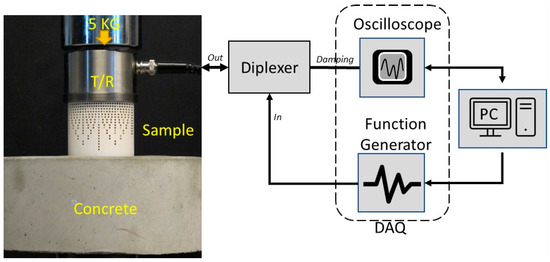 Schematic of the experimental setup for the pulse–echo measurement depicting a diplexer, function generator, oscilloscope, and a laptop PC. Image with transducer, concrete, DL, and a dead load can be seen in the PE configuration.