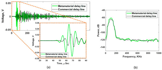 The pulse from the metamaterial DL arrives earlier than that from the commercial DL, indicating an overall higher velocity in the metamaterial DL, as expected. Figure 10b shows the frequency power spectrum for both the DLs. The similar energy distribution indicates that there is no spectral filtering occurring in the fabricated DL. Further, the energy transferred by the metamaterial DL at the peak frequency is higher than that by the commercial DL.