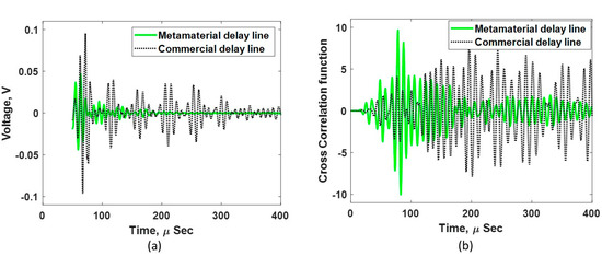 To better visualize the concrete reflection signal in the PE signal output in Figure 11a, the acquired signal was further processed, as follows. First, the transducer with the DL was detached from the concrete and a PE measurement was taken (while it was in the air). Then, the signals obtained while in contact with the concrete and air were subtracted. Finally, the resultant signal was cross-correlated with the input Gaussian pulse, resulting in the signal shown in Figure 11b. The concrete end reflection (at about 82 µs) can be clearly seen using the metamaterial DL, whereas the commercial delay line response was noisy and unable to detect the concrete end signal. This result, once again, indicates that the metamaterial DL has a superior energy transmission and damage detection capability for concrete inspections.