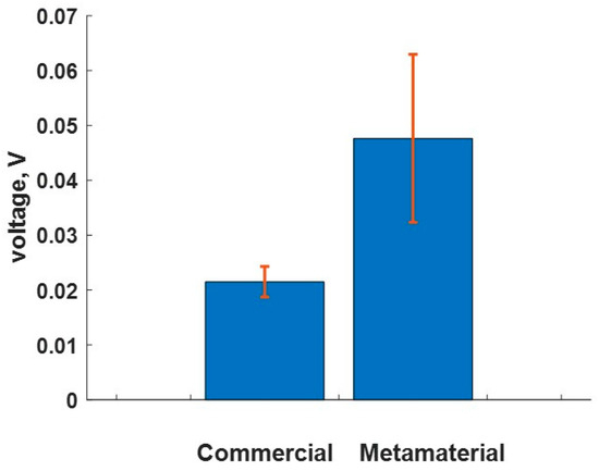 For the metamaterial DL, the impedance at the sensor–DL interface is better matched compared to that at the DL–concrete interface. This poorer match at the DL–concrete interface is due to the maximum impedance limit of the Rigid 10K material at full density. However, the commercial DL has a larger impedance mismatch at the DL–concrete interface, leading to much of the energy being reflected at this interface. This phenomenon can be visualized more clearly in the PE measurement, as shown in Figure 11a. The TT measurement was repeated five times for each DL, and the statistical results of first pulse magnitude are shown in Figure 12. The average maximum voltage of the first pulse with the metamaterial DL was ~0.05 V, a 120% increase compared to the commercial delay line, which also matched closely with the expected 127.2% increase. A relatively large variation in the maximum voltage was noted for the metamaterial DL, which could be due to the inconsistent coupling at the DL–concrete interface that is associated with the unknown and non-uniform roughness of the printed metamaterial DL.