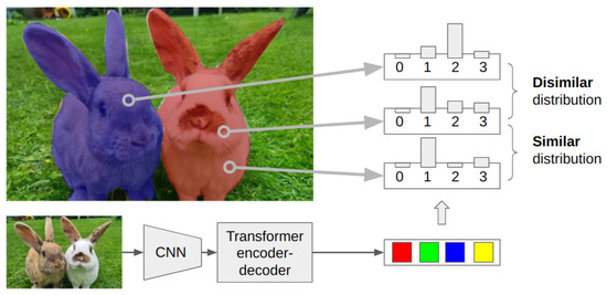 Illustration of the clustering-based approach. Based on the learned object queries, we compute the output of the decoder for a pixel, representative of the features of the object the pixel is embedded in, as a probability distribution. Our learning objective guides the decoder to output similar distributions for pixels embedded in the same object and different distributions for a pixel pair embedded in different objects.