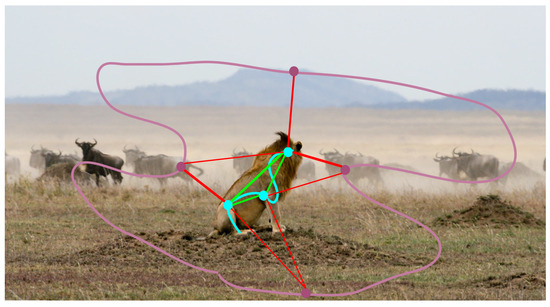 Selection of pixel pairs in foreground and background regions. The foreground object (lion) is annotated by a cyan scribble, the background by a pink scribble. Positive pairs (green lines) are selected between points of the foreground object, but not between points of the background. Negative pairs (red lines) are selected between points of different clusters: in this figure between the background and the foreground object. This way, the model is not forced to recognize the background as a single homogeneous object; instead, it can segment into unlabeled distinct clusters, e.g., other animals, ground, mountain, and sky in this figure.