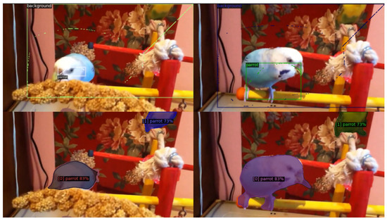 Benefits of omitting the positive pairs between background points. Top row: ground truth frames. The scribbles are shown at the original resolution (1 pixel wide curves), and the bounding boxes are displayed only as visual guides for the scribbles. Bottom row: prediction. The parrot at the top-right corner of both frames is detected correctly, even though it was not annotated. By not enforcing similarity between different regions of the background, it can maintain its heterogeneity.