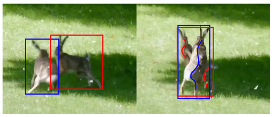 Left: Although the image is not completely sharp, the extent of the individuals can be specified with the help of a bounding box. Right: The instances are still clearly distinguishable, despite the fact that the edges are blurred, but the bounding boxes that border them almost completely coincide, since the two individuals cross each other. It is not clear which bounding box is the annotation of which instance. On the other hand, the surfaces belonging to each individual can be clearly marked with scribbles. Blue and red bounding boxes and scribbles identify different instances.