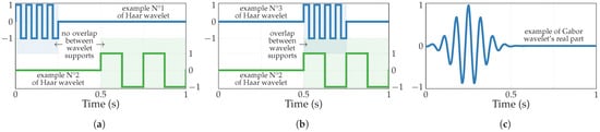 In this study, two principal wavelet families that can be realized in an analog manner, namely Haar and Gabor wavelets, are utilized to implement NUWS-based feature extraction. Examples of these wavelets are shown in Figure 2. Haar wavelets [] represent a family of square functions that alternate between 1 and −1 within their support, turn to 0 elsewhere, and are straightforward to generate. On the other hand, Gabor wavelets, rather challenging for a generation with tunable parameters, result from the multiplication of a complex exponential by a Gaussian window.