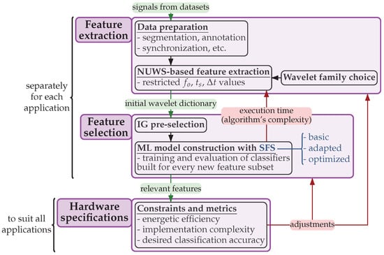 To summarize, a visualization of the overall methodology applied throughout this study is shown in Figure 3. It involves the following three main steps: performing the feature extraction and feature selection separately for each studied application and defining hardware specifications that suit all applications to build a generic A2F converter.