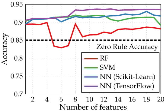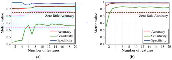 Figure 4 demonstrates the results obtained with three different types of classification models built without using SFS feature selection after the IG algorithm: random forest (RF), support vector machine (SVM), and artificial neural network (NN). The latter was built with one hidden layer of 10 neurons using scikit-learn and TensorFlow for comparison. Both are software ML libraries available in Python. However, among other differences, scikit-learn is a higher-level one with a broader range of models. In contrast, TensorFlow is more of a low-level library implied for use with NNs and allows to take advantage of GPUs for more efficient training. Here (and in the following figures), we plot the accuracy (or other metrics) against the number of chosen features. The accuracy of a zero rule classifier, which attributes to every tested example the most frequent class present in the test set (85% of heartbeats in the test set are without arrhythmia), is shown as a reference. The NN classifier built and trained with TensorFlow provided the best performances; hence, this configuration was chosen for further simulations with the SFS algorithm.