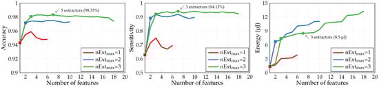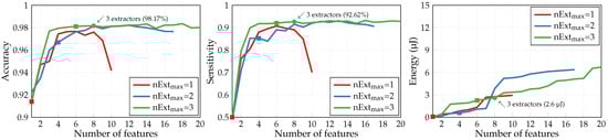 Figure 6 illustrates the performances produced by the adapted SFS algorithm with three different values of a maximum number of parallel extractors . For each curve, the square marker shows the point when the maximum number of extractors is reached. Limited to three feature extractors, the algorithm achieves a 98.33% accuracy and a 94.13% sensitivity with seven extracted features and μJ energy consumption (green round marker in Figure 6). Similar results have been previously obtained in [], where the extraction of six features by three extractors also entailed the consumption of μJ to achieve a 98.4% accuracy. Thus, this new validated simulator can be employed further for our second application of the A2F converter.