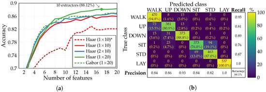 Figure 7a illustrates the accuracy of multiclass HAR obtained with the basic SFS algorithm by NN classifiers of different structures: one hidden layer of 10 neurons, two hidden layers of 10 neurons, and one hidden layer of 20 neurons. To improve the classification accuracy further, we switched the kernel and bias initializers of the hidden layer from the default “glorot uniform” and “zeros”, respectively, to “random uniform”. The only example utilizing the default initializers in Figure 7a is plotted as a red dashed curve. It corresponds to an NN classifier with one hidden layer of 10 neurons trained with Haar wavelets. Gabor wavelets, though less straightforward to generate, are generally more effective than Haar wavelets. However, they yield a significantly lower classification accuracy in our specific case, as shown by the green dashed curve. Consequently, we will not proceed with their usage further. The preferable configuration (Haar wavelets, NN classifier with one hidden layer of 20 neurons) achieves an 88.12% accuracy with 17 features extracted by 10 extractors (green round marker). Its confusion matrix with color mapping based on recall (sensitivity) is presented in Figure 7b. Since it is a multiclass classification, the sensitivity represents the proportion of instances of a given class that are correctly predicted. The precision, i.e., the fraction of relevant instances among those predicted as a given class, is provided below the confusion matrix for complementary information. Quite a substantial confusion between sitting and standing ADLs can be noticed due to similar local shapes of inertial measurements’ time series corresponding to these static activities.