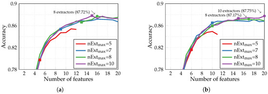 Executing the multiclass HAR with adapted SFS for the identical preferable dictionary-classifier configuration produces the accuracy curves depicted in Figure 8a. On all four curves with different values of a maximum number of extractors, the square marker again indicates the point when this maximum is reached. Notably, the case with set to 10 yields a lower accuracy of 87.8% (with 15 extracted features) compared to the basic SFS with 10 extractors as well (green round marker in Figure 7a). The reason is that when training an NN classifier, the parameters are initialized randomly. It impacts how different feature subsets perform and which features are added afterward to the target set. Furthermore, by decreasing the number of extractors to eight, we can extract 16 features to achieve a slightly lower classification accuracy of 87.72% (green round marker in Figure 8a). In this particular case, out of the six available inertial signals, only x- and y-axes of acceleration and z-axis of angular velocity produce the required features. And since solely two features are extracted from the gyroscope, a similar simulation has been conducted but with acceleration signals alone producing the features. According to the results presented in Figure 8b for , we can restrict our use to a single type of inertial sensor—an accelerometer—at a moderate loss in classification accuracy (down to 87.17%).