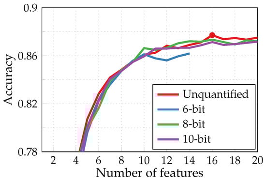 Below, we demonstrate the results of a similar study for HAR to determine the necessary specifications for the ADC. Figure 10 presents the impact of the quantification level on the accuracy of the multiclass HAR classification performed by NN classifiers with the adapted SFS algorithm limited to eight parallel extractors and with features generated from acceleration and angular velocity signals (see green curve in Figure 8a). The training and test sets provided for NN classifiers were composed of features quantified after the pre-selection by the IG criterion. The choice of features by the SFS algorithm and, thus, the classification accuracy are inevitably affected by the level of quantification since some features no longer supply relevant information for classification. In contrast to the arrhythmia detection task, for a 6-bit precision, a noticeably lower accuracy is achieved with respect to unquantified cases, and even more extractors are required to accommodate more than 15 features. Conversely, an 8-bit precision already achieves an accuracy of a similar order as without quantization, despite the variability of classification performances. Such fluctuations are induced by the process of random initialization of weights and biases while training a new NN classifier each time we increase the number of input features.
