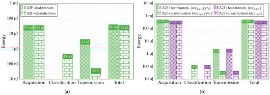 While our multiclass HAR classifier provides a lower accuracy on the UCI-HAR dataset compared to state-of-the-art CNN models (see Table 3), it requires at least 102 times fewer parameters and a 23 times smaller input size. We can implement this simple feedforward NN with still digital architecture directly within the sensor rather than at the aggregator level. It will help further cut down on energy usage due to the wireless transmission by sending exclusively the classification results. Furthermore, employing analog memristor-based, reconfigurable NN [,,,] will enable digitizing strictly the classifier’s decision while providing the application- or context-specific adaptation. The current order of HAR classification accuracy may suffice for non-critical applications. However, if necessary, it is still possible to enhance accuracy and reliability by acquiring additional types of signals and enabling data fusion [] and distributed event detection []. Feature stacking has yet to be considered and may also be applied in future works to improve classification performance by combining the predictions from several ML models.