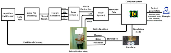 The computer system assumes a vital role, leveraging the outcomes from the fuzzy classifier to autonomously regulate both the stimulator and the exoskeleton robot. This closed-loop system dynamically adjusts the rehabilitation process based on the patient’s estimated pain levels, enabling personalized and responsive therapy. Figure 1 encapsulates a complex yet coherent framework integrating EMG signal acquisition, preprocessing, feature extraction, pain estimation, and autonomous control of the rehabilitation robot and stimulator. Ultimately, this integration enhances the effectiveness and adaptability of the rehabilitation process.