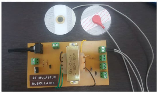 The specialized stimulator developed in our laboratory (seen in Figure 4) is purpose-built to seamlessly integrate with an exoskeleton robot, featuring a sophisticated printed circuit board (PCB). Designed with intricate attention to detail, this PCB stimulator possesses a compact form perfectly suited for incorporation within the exoskeleton’s structure. Precision engineered, it houses premium electronic components strategically placed for precise control over stimulation parameters like voltage, frequency, and pulse width. Indeed, the output voltage can be adjusted by using the implemented potentiometer. On the other hand, frequency and pulse width can be adjusted via signals from a microcontroller. The main specifications of the designed stimulator are illustrated in Table 2. Its user-friendly interface empowers researchers to efficiently configure stimulation settings. The stimulator’s innovative design includes communication interfaces that foster seamless interaction between the exoskeleton robot and the stimulator, optimizing synchronization and control. Its adaptable nature and tailored integration offer a valuable tool for conducting targeted upper limb rehabilitation experiments, enhancing the study and refinement of robot-assisted rehabilitation protocols.