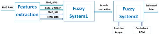 Within the rehabilitation realm, the precise pain threshold often remains an approximation rather than an exact value. Consequently, a concept of partial reality becomes crucial, where decisions are derived from a set of fuzzy constraints. The occurrence of a current peak, typically stemming from a subject’s resistance force, does not definitively confirm severe pain, as it might result from various factors. However, when this peak coincides with muscular contraction, it strongly indicates the subject’s pain level. Surprisingly, pain itself may not always lead to movement cessation or alterations; at certain rehabilitation stages, intense pain may be a natural symptom. A fuzzy decision support system needs to include a third input function for final decision making in order to handle this complexity. The patient’s resistance and the previously attained range of motion (RoM) are integrated by the fuzzy system in the suggested architecture. Even in the face of terrible pain, the robot is able to proceed with rehabilitation thanks to this fuzzy logic framework as long as the recovery objective has been met in the past. The system is made up of two blocks: the first uses data from the EMG sensor (EMG_RMS, EMG_SSI, EMG_vorder, and EMG_logdetect) to estimate muscle contraction, and the second evaluates pain intensity based on patient resistance, muscle contraction, and the most recent RoM. The fuzzy architecture that is provided is seen in Figure 5.