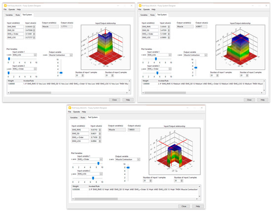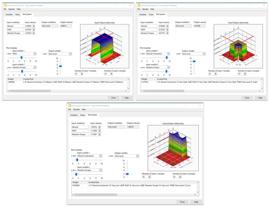 To monitor pain levels and control the rehabilitation system, a fuzzy system was developed using the LabVIEW PID and Fuzzy Logic Toolkit. The input and output membership functions are represented as Gaussian shapes. Furthermore, the center of area method was employed for de-fuzzification purposes. Given that EMG constitutes a bio-signal contingent upon individual subjects and is notably influenced by measurement conditions and electrode placement, normalization of EMG data is crucial. This involves mapping the time domain parameters to ensure uniformity and comparability across different subjects’ EMG readings.