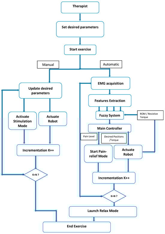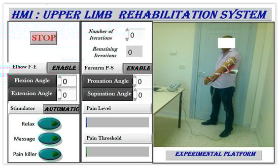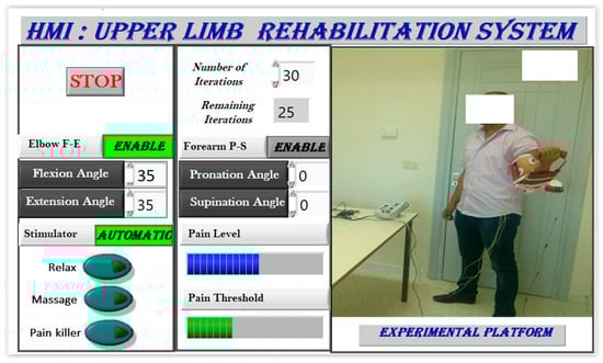During the upper limb rehabilitation session employing a rehabilitation robot and electrical stimulator, the physiotherapist initiates the process by inputting specific parameters into a LabVIEW-based human–machine interface (Figure 8). This action triggers the start of the rehabilitation exercise. Initially, the therapist selects the stimulation mode, which can either be manual or automatic. In manual mode, the computer system updates the parameters, executes the chosen stimulation mode, and operates the rehabilitation robot for the designated number of iterations. The therapist retains control to manually enable any stimulation mode based on the patient’s condition. Conversely, the automatic mode relies on acquired EMG signals to gauge the patient’s muscle state in real time. A fuzzy controller estimates muscle pain by analyzing muscle features, range of motion, and joint torque. The main controller then adjusts the rehabilitation robot and stimulator based on this pain estimation, enabling the exercise without direct therapist intervention. Once the predetermined cycles conclude, the stimulator transitions automatically to a relaxation mode. It is highly recommended for the physiotherapist to use the manual mode before moving to the automatic mode. Indeed, the physiotherapist can use the manual test to understand the main features of the designed rehabilitation system. By supervising the feedback of the patient in each stimulation mode, the physiotherapist can select the suitable pain level threshold, which will be used in the automatic mode.