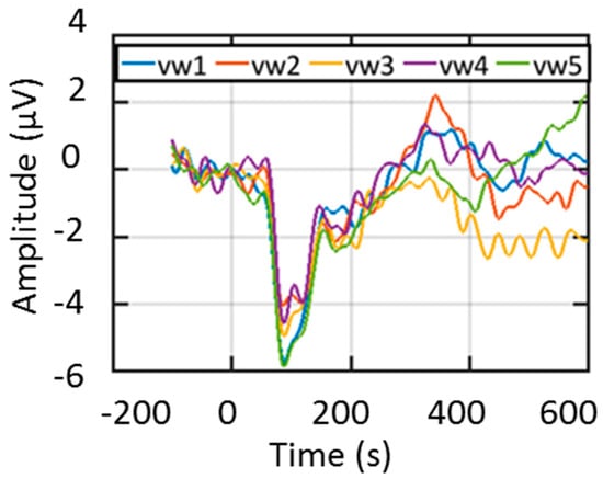 A representative multi-trial ERP from a subject with auditory stimuli of vw1, vw2, vw3, vw4, and vw5.