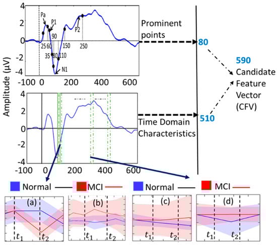 Given the rapid temporal changes in ERPs during the application of a stimulus, it is crucial to capture the high-resolution variations in time-domain characteristics. To achieve this, we implemented a 25 ms window with a 50% overlap across the entire ERP signal, as illustrated in Figure 2. The sliding window methodology enables the observation of time-domain property variations, a factor previously shown to be significant in distinguishing between MCI and normal subjects in earlier studies [19]. A total of 107 time-domain characteristics, including signal statistics, correlation properties, and entropies, were computed from each window using the open-source software package “HCTSAtool” [29] in MATLAB (r2018b). For details on the extracted time-domain characteristics, please refer to [31,32,33]. To assess the variation in time-domain characteristics over time, we calculated the slope and the coefficient of variation (CV) from two feature points at each time stamp for every stimulus. In the selection process for the CFV, feature points demonstrating both intra-class similarity and inter-class variability, determined through visual inspection, were included. For instance, Figure 2a,b displays the slope and CV of a time-domain characteristic (computed by HCTSAtool as “proportion of data within two-standard deviation of mean” [34,35,36]) for the normal and MCI groups, revealing intra-class similarity within the shaded regions but inter-class variability, thereby making it a CFV feature point. Similarly, the slope and CV in Figure 2c,d at different time frames exhibit both intra-class similarity and inter-class variability, meeting the criteria for inclusion in the CFV. Out of all time-domain feature points, 510 fulfilled the conditions mentioned above, securing their place in the CFV.