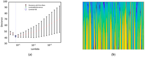 (a) Lasso regression-based feature selection: five-fold cross-validated mean squared error/deviance vs. lambda. (b) time–frequency image feature sample.