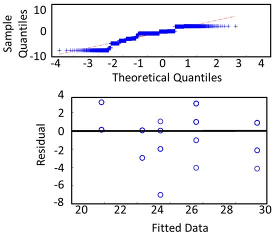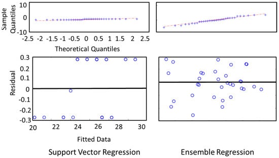 In Figure 7, we depict the residual analysis results of the two best-performing regression models (SVR, ER). For each regression model, we presented two graphical analysis: (a) sample quantiles vs theoretical quantiles of the residuals or quantile–quantile plot (qqplot), and (b) residuals vs fitted data by the regression model. The qqplot of the residuals is generally used to verify the assumption that the residuals are normally distributed. As both of the models show normal patterns (an approximately straight line) in the qqplot, the models pass the normality test. We further analyzed the residual vs fitted plot. A good regression model should be homoscedastic, which means its residual is uncorrelated, uniform, and random over the fitted or predicted value. The obtained results fit a good regression model criterion.