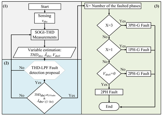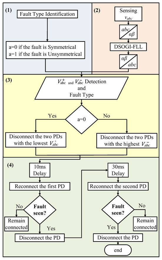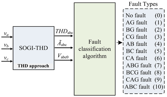 In this work, each PD is equipped with an algorithm to detect faults using the measured , , and of the grid voltage. The measured value is essential for fault identification in the case of phase-to-phase faults. The detection algorithm in this study offers a distinct approach for measuring the THD using the SOGI [28]. The detection additionally includes a fault classification algorithm for achieving high accuracy and detecting both symmetrical and unsymmetrical faults. Figure 1 represents the concept behind the THD method.