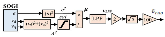 where is defined as . Figure 3 presents the THD calculation block diagram, yielding . The multiplication by 100 is performed to express the value in a percentage scale, and the saturation function is employed to prevent division by zero. Moreover, the design of the LPF aims to achieve a balance between the transient response speed and managing distortion levels within the THD signal.