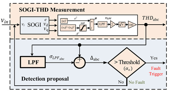 The integration of the SOGI-FLL in this THD measurement approach offers fast fault detection. Fault occurrences are typified by abrupt and substantial fluctuations in grid voltages, eliciting responses across the entire spectrum of harmonic components. As a result, the derived THD assumes a pivotal role in expediting fault detection, constituting the foundational element of the detection algorithm.