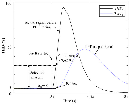 At the time of the fault, a rapid transient in is generated, which takes time to become noticeable at the output of the low-pass filter. Furthermore, during a fault, the THD exhibits a peak-pulse waveform that exponentially decays over time, see Figure 5. However, at the precise moment of the fault, remains in proximity to the THD level that was present before the fault. Therefore, the difference,, corresponds directly to the disparity between the actual THD and the previous THD level that existed in the grid at the time of the fault.