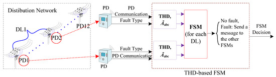 In this work, the FSM described in [15] is utilized as an initial layer of protection, which relies on two distinct communication protocols (see Figure 7): a Wi-Fi protocol between the PDs and FSM [37] and the IEC 61850 protocol [38] between the FSMs themselves for proper coordination and to ensure effective protection. Figure 8 depicts the conceptual diagram of this protection layer. In Figure 7, six FSMs are designated for detecting and isolating the faults in various locations of the DS. Each FSM in the system is allocated to a DL with two PDs and comprises six unique states, whose state flow chart diagram is shown in Figure 9.