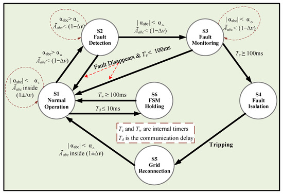 It is worth noting that if a non-faulted FSM is in S1 and a fault signal is received from a faulted FSM, the non-faulted FSM moves to S6 (Holding FSM) to wait for the fault to be resolved or isolated. During this time, a timer named starts counting up, and when it reaches 100 ms, the FSM returns to its normal operating state (S1).
