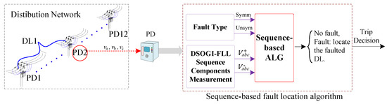 The fault location algorithm is a secondary layer in the system that operates at each PD and employs the voltage sequence components of the PD during fault events [28,42] to determine the fault’s location. The algorithm’s kernel is based on the behavior of the sequence components, which depends on the type of fault, whether it is symmetrical or unsymmetrical, and has the advantage of not requiring communication links between PDs. Moreover, this algorithm relies only on local information gathered by each PD to detect the faulted DL. Figure 10 depicts the conceptual diagram of this protection layer. The algorithm is composed of four stages, which are further elaborated below and depicted in Figure 11.