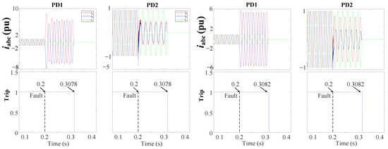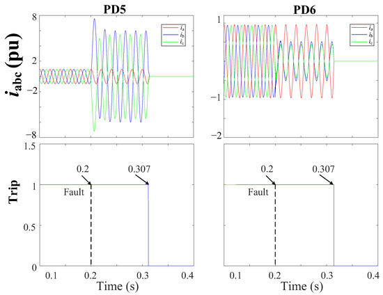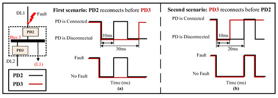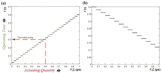 It is crucial to emphasize that two PDs located on opposite sides of each bus are connected, i.e., “bus 6 is connected to both PD6 and PD7”, see Figure 7. This implies that at each bus, two points with identical voltages are acquired, resulting in matching sequence voltages. Consequently, if a fault happens, both PDs will be disconnected simultaneously as an initial protection measure. Therefore, the disconnection of the aforementioned PDs conforms to the definite time-voltage characteristic curves, as illustrated in Figure 13, and is predicated upon the type of fault.