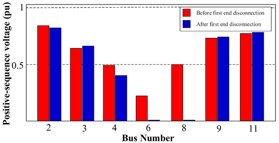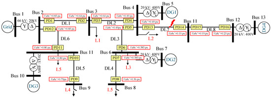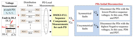 The behavior of the sequence voltages is dependent on the type of fault detected, which is the kernel of this algorithm for the secure location of the faulted DL. For instance, in the case of symmetrical faults, i.e., a 3PH-G fault at the end of DL3, see Figure 7, the faulted DL can be located by monitoring the Positive-Sequence Voltage (PSV) during the fault. The simulations showed that during the fault, the PSV at PD6 of DL3, which is the nearest to the fault, will be lower than that of the other unfaulted DLs [28,42]. As a result, PD6 with the lowest PSV value will be disconnected to isolate the faulted DL more quickly than the other PDs.