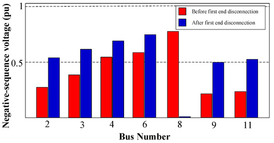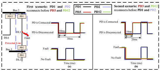 In the case of unsymmetrical faults, i.e., a 1PH-G fault at the end of DL1, see Figure 7. The location of the faulted DL can be determined by examining the Negative-Sequence Voltage (NSV) behavior. Specifically, the NSV at PD2 of DL1 will be higher than that of any other PDs. Thus, in this scenario, PD2 that detects the fault with the highest negative-sequence value will trip first, before the other PDs.