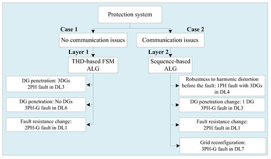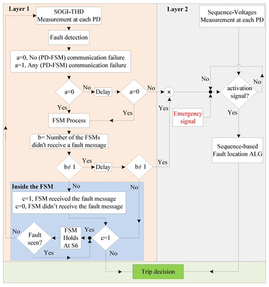 A secure protection is proposed using a dual-layer protection strategy. The first layer consists of a THD-based Finite State Machine (FSM), which works once the fault is detected by the SOGI-THD detection algorithm and using the measured , , and of the PDs of each DL. Each DL has an FSM that will be coordinated with the others in the PDs by means of the communication for secure protection. The second layer is a sequence-based fault location algorithm that will use the sequence-voltage components’ behavior during the fault to isolate it. This algorithm is employed at each PD without the need for communication links; therefore, this level can be used as pack-up protection in the case of poor communication to provide reliable and redundant protection.